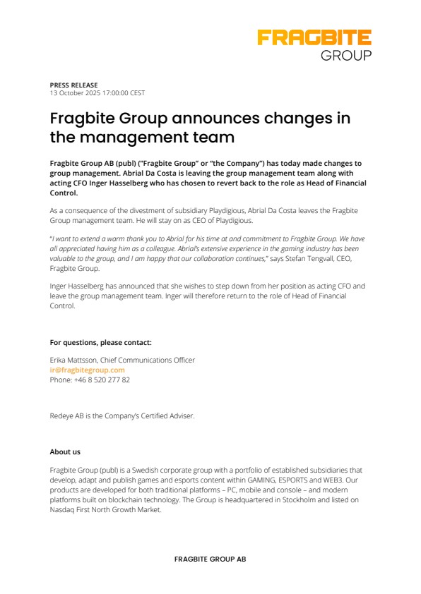 Fragbite Group AB (publ) (”Fragbite Group” or “the Company”) has today made changes to group management. Abrial Da Costa is leaving the group management team along with acting CFO Inger Hasselberg who has chosen to revert back to the role as Head of Financial Control.