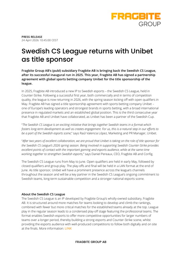 Fragbite Group AB’s (publ) subsidiary Fragbite AB is bringing back the Swedish CS League, after its successful inaugural run in 2025. This year, Fragbite AB has signed a partnership agreement with global sports betting company Unibet for the title sponsorship of the league.