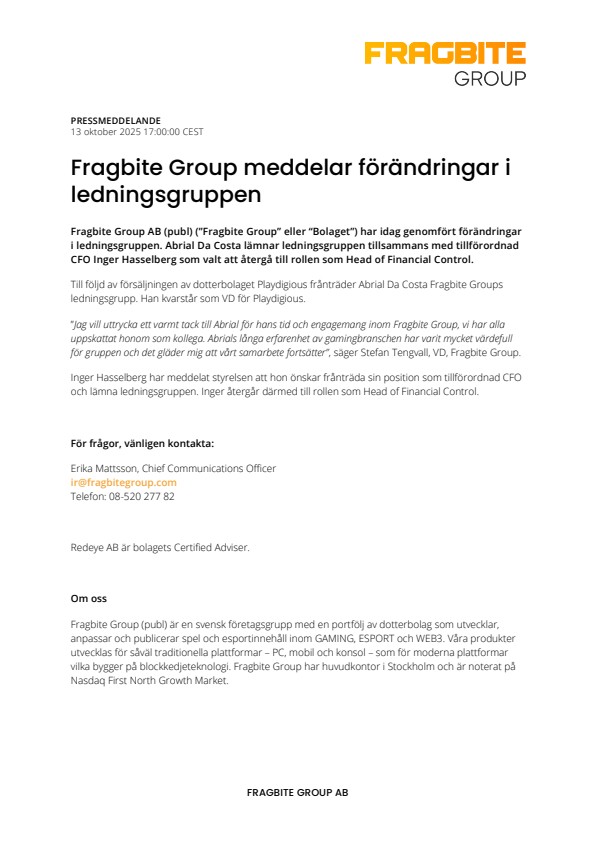 Fragbite Group AB (publ) (”Fragbite Group” eller “Bolaget”) har idag genomfört förändringar i ledningsgruppen. Abrial Da Costa lämnar ledningsgruppen tillsammans med tillförordnad CFO Inger Hasselberg som valt att återgå till rollen som Head of Financial Control.