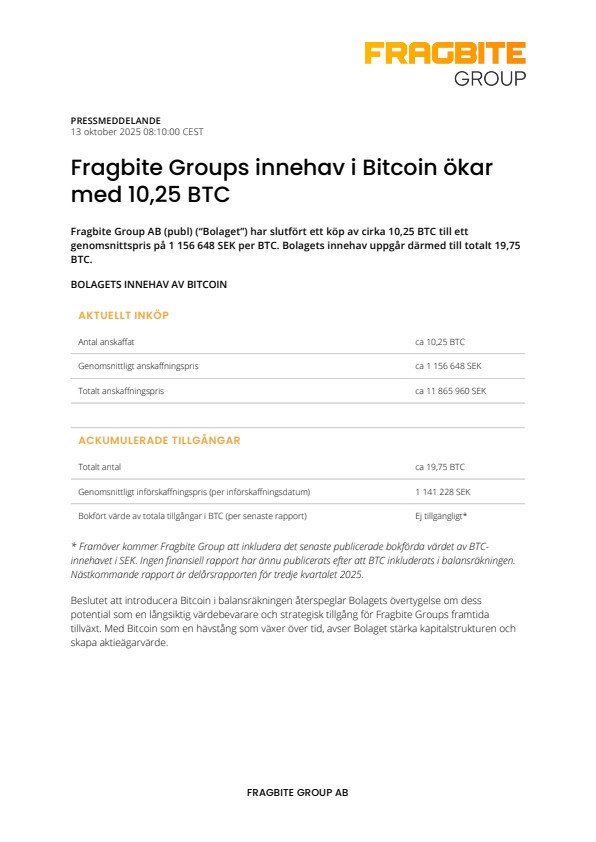 * Framöver kommer Fragbite Group att inkludera det senaste publicerade bokförda värdet av BTC-innehavet i SEK. Ingen finansiell rapport har ännu publicerats efter att BTC inkluderats i balansräkningen. Nästkommande rapport är delårsrapporten för tredje kvartalet 2025.