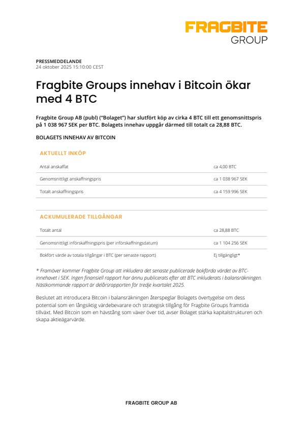 * Framöver kommer Fragbite Group att inkludera det senaste publicerade bokförda värdet av BTC-innehavet i SEK. Ingen finansiell rapport har ännu publicerats efter att BTC inkluderats i balansräkningen. Nästkommande rapport är delårsrapporten för tredje kvartalet 2025.