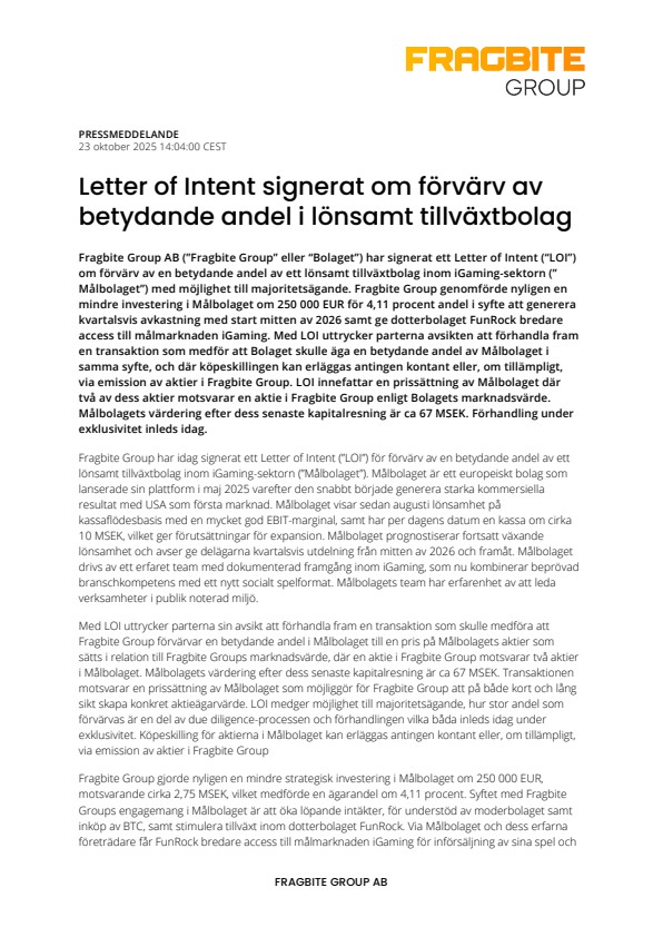 Fragbite Group AB (”Fragbite Group” eller “Bolaget”) har signerat ett Letter of Intent (“LOI”) om förvärv av en betydande andel av ett lönsamt tillväxtbolag inom iGaming-sektorn (”Målbolaget”) med möjlighet till majoritetsägande. Fragbite Group genomförde nyligen en mindre investering i Målbolaget om 250 000 EUR för 4,11 procent andel i syfte att generera kvartalsvis avkastning med start mitten av 2026 samt ge dotterbolaget FunRock bredare access till målmarknaden iGaming. Med LOI uttrycker parterna avsikten att förhandla fram en transaktion som medför att Bolaget skulle äga en betydande andel av Målbolaget i samma syfte, och där köpeskillingen kan erläggas antingen kontant eller, om tillämpligt, via emission av aktier i Fragbite Group. LOI innefattar en prissättning av Målbolaget där två av dess aktier motsvarar en aktie i Fragbite Group enligt Bolagets marknadsvärde. Målbolagets värdering efter dess senaste kapitalresning är ca 67 MSEK. Förhandling under exklusivitet inleds idag.