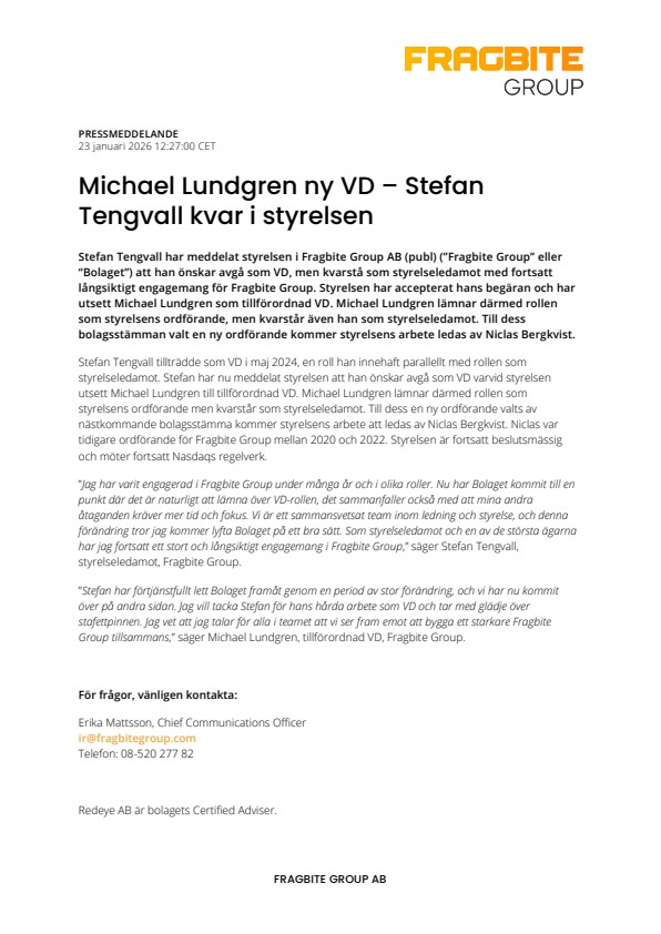 Stefan Tengvall har meddelat styrelsen i Fragbite Group AB (publ) (”Fragbite Group” eller “Bolaget”) att han önskar avgå som VD, men kvarstå som styrelseledamot med fortsatt långsiktigt engagemang för Fragbite Group. Styrelsen har accepterat hans begäran och har utsett Michael Lundgren som tillförordnad VD. Michael Lundgren lämnar därmed rollen som styrelsens ordförande, men kvarstår även han som styrelseledamot. Till dess bolagsstämman valt en ny ordförande kommer styrelsens arbete ledas av Niclas Bergkvist.