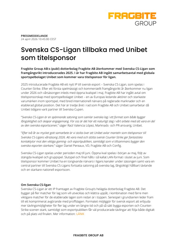 Fragbite Group AB:s (publ) dotterbolag Fragbite AB återkommer med Svenska CS-Ligan som framgångsrikt introducerades 2025. I år har Fragbite AB ingått samarbetsavtal med globala sportspelbolaget Unibet som kommer vara titelsponsor för ligan.